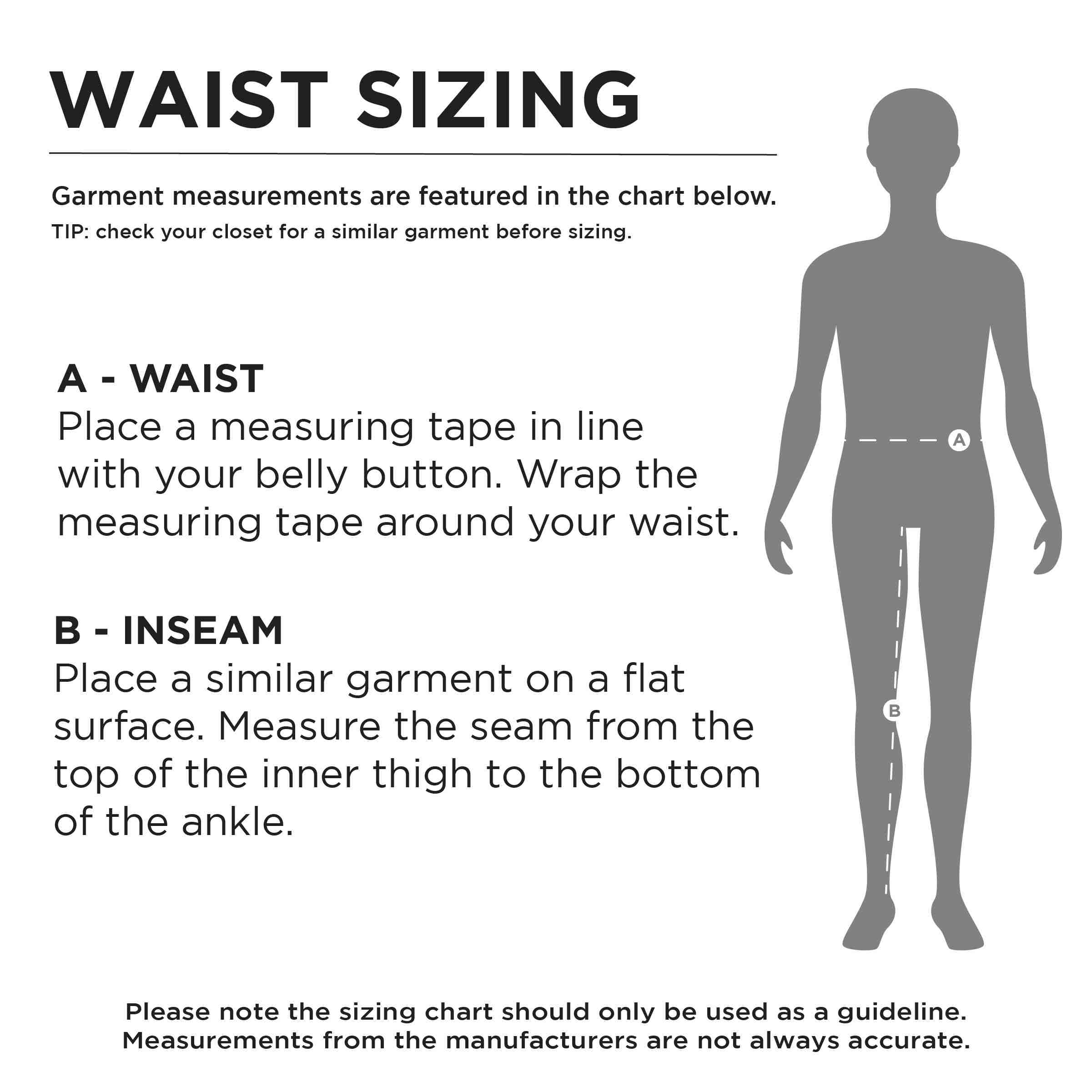 | Inseam | 26" | 27" | 28" | 29" | 30" | 31" |